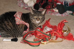 Our oldest daughter returned to her post-doctoral position in the Pacific Northwest yesterday, officially ending the holidays in the Wilkins household (our other daughter and her husband went back to New England a few days earlier for her to resume her medical residency and him to start graduate school studies). Our son will return to college in the next week or so, and empty nest syndrome will once again set in here. Poor Izzie misses the kids almost as much as my husband and I do! She’s pictured above sitting among bits of discarded ribbon on Christmas day (she managed to get the one on her back all by herself, as if she wanted to be dressed in Christmas finery, too!). See the makeup brush in the photo? That’s her favorite toy. She stole one of my makeup brushes soon after moving in with us almost eleven years ago and the brush is rarely out of her sight. This is actually her second brush — the first one finally disintegrated, but she seemed happy enough with the substitute. Silly cat.