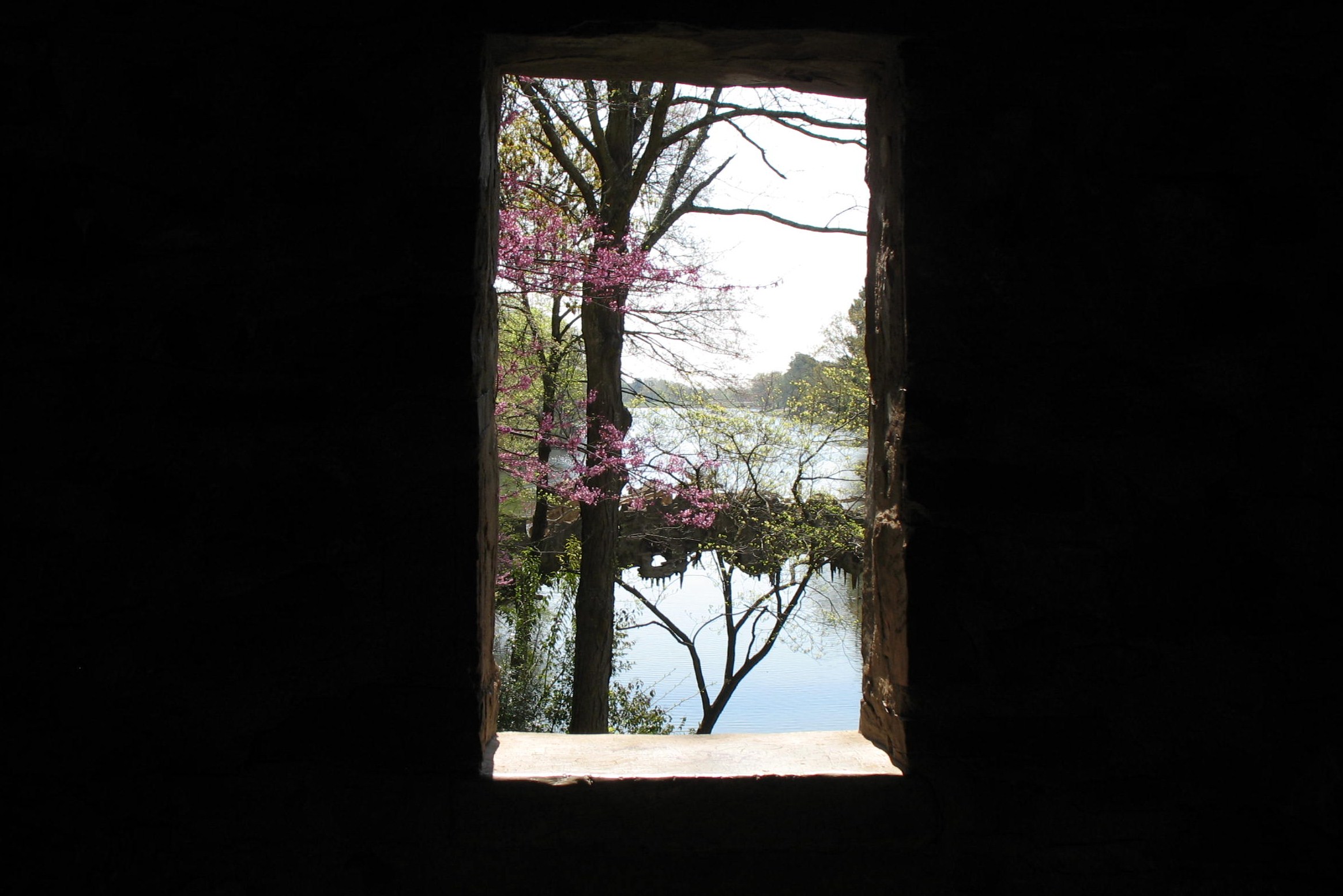 This first day of April was an absolutely beautiful day here in Arkansas. Clear, 82 degrees, a little breezy. Tomorrow is supposed to bring storms — potentially severe storms, which is always a worry in the south — but today was gorgeous. I was unable to resist getting out to play with my camera, so my husband and I had lunch out and whiled away a little time at North Little Rock’s Old Mill, a faux-wood-and-rock structure made of concrete built in 1933 and featured in the opening of the movie, “Gone With the Wind.” The little park surrounding the mill is beautifully landscaped; dogwoods, redbuds, pansies, jonquils and a few other flowers are in full bloom and the azalea bushes are heavy with buds about to pop into color. The photo above was taken from inside the Old Mill. I’ll use a few of the other shots I took today in later posts.
